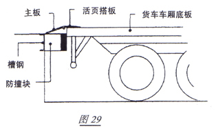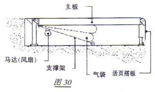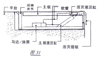 低壓高容量空氣動力系統(氣袋式)設計簡單(圖30)它利用一個與風機連接在一起的氣袋提升起主板,主板靠自身重量在下降時利用動推杆推出活頁搭板,搭在貨車車廂底板上。這種設計非常可靠,絶少需要維修。(氣袋作用只是提升主板;不起任何承重作用)