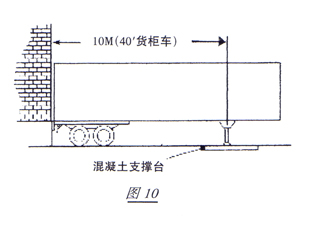 如泊車區地面没有鋪設混凝土或鋪設的是瀝青,在平台前適當的距離,與平台墻壁平行處,需鋪設堅固的混凝土支撑台,在拖車退靠在平台前,拖車頭開走後,支撑貨櫃(或車廂)前部的重量(圖10)。標准40英尺貨櫃車的支撑台位距貨櫃尾端約10米;20英尺貨櫃車,此距離約為3.5米。支撑台長度如能一直延伸至平台墻壁更佳,且要有足够寬度以適應不同車輛。為支撑滿載的貨車或有叉車開上的貨車,支撑點需有兩個,相距1.8米,各能承重至少12噸。 |
