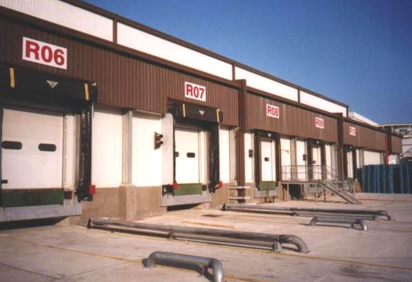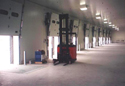 大型食品冷凍倉庫的裝卸貨設備,主要包括高度調節板及工業滑升門。