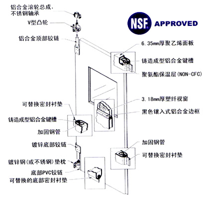 保温層結構:聚氨酯保温材料灌注發泡成型,符合環保(NON-CFC)要求,且永久與面板相粘、形成一體;可承受强大衝撃力;具有極佳的防噪音及保温性能。保温系數R=10.83。 |