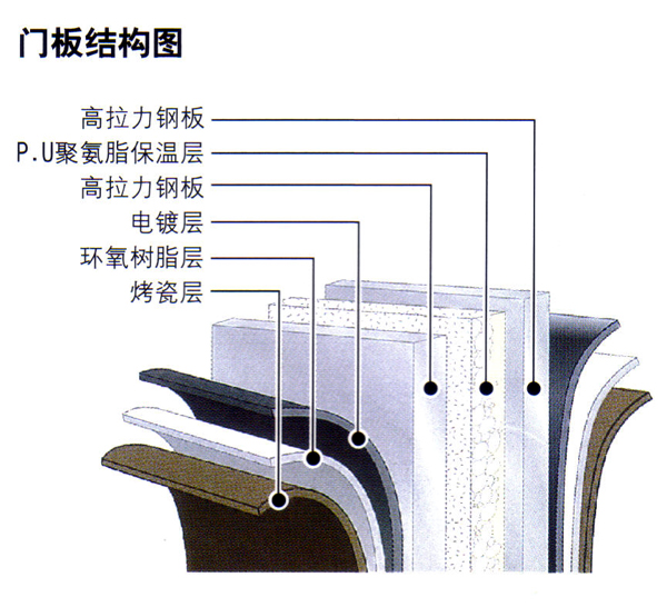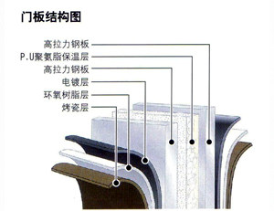 節式門板:由優質鋼板壓制而成,經鍍鋅處理、塗環氧樹脂塗層處理後,再採用最先進的烤瓷技術處理,使外形更為美觀 大方,長久使用不會發沙發暗。門板每塊高60厘米或53厘米,門板内夾聚氨 脂(P.U)保温層。